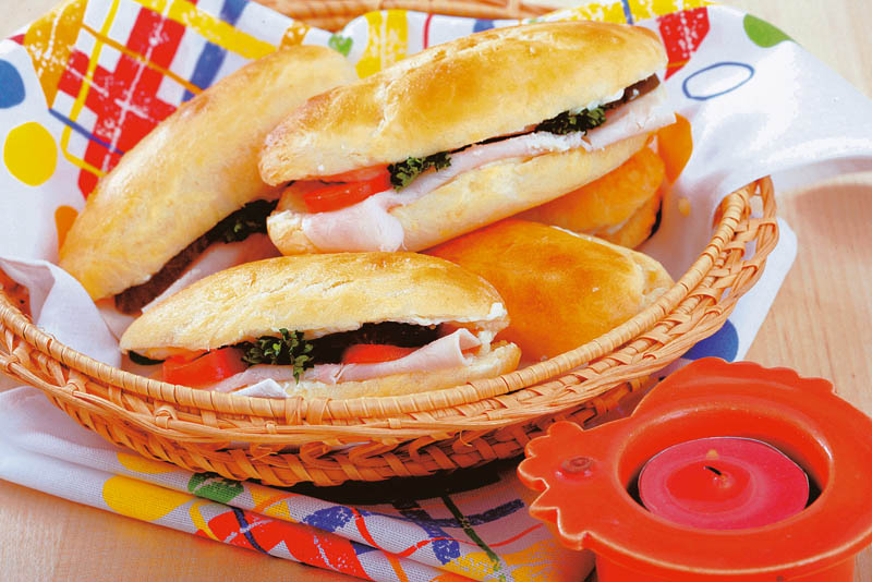 2. Cornurile se taie în două şi se umplu cu crema de brânză, peste care se presară caşcaval ras şi măsline tăiate rondele. Se adaugă feliile de şuncă, unse cu puţin muştar şi pliate în două, roşiile şi câteva fire de pătrunjel verde.