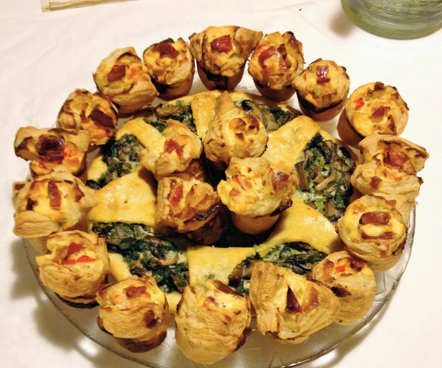 5.    Se aşază umplutura de ciuperci pe marginea tartei, lăsând mijlocul liber. Cu un cuţit, se taie aluatul în opt triunghiuri .