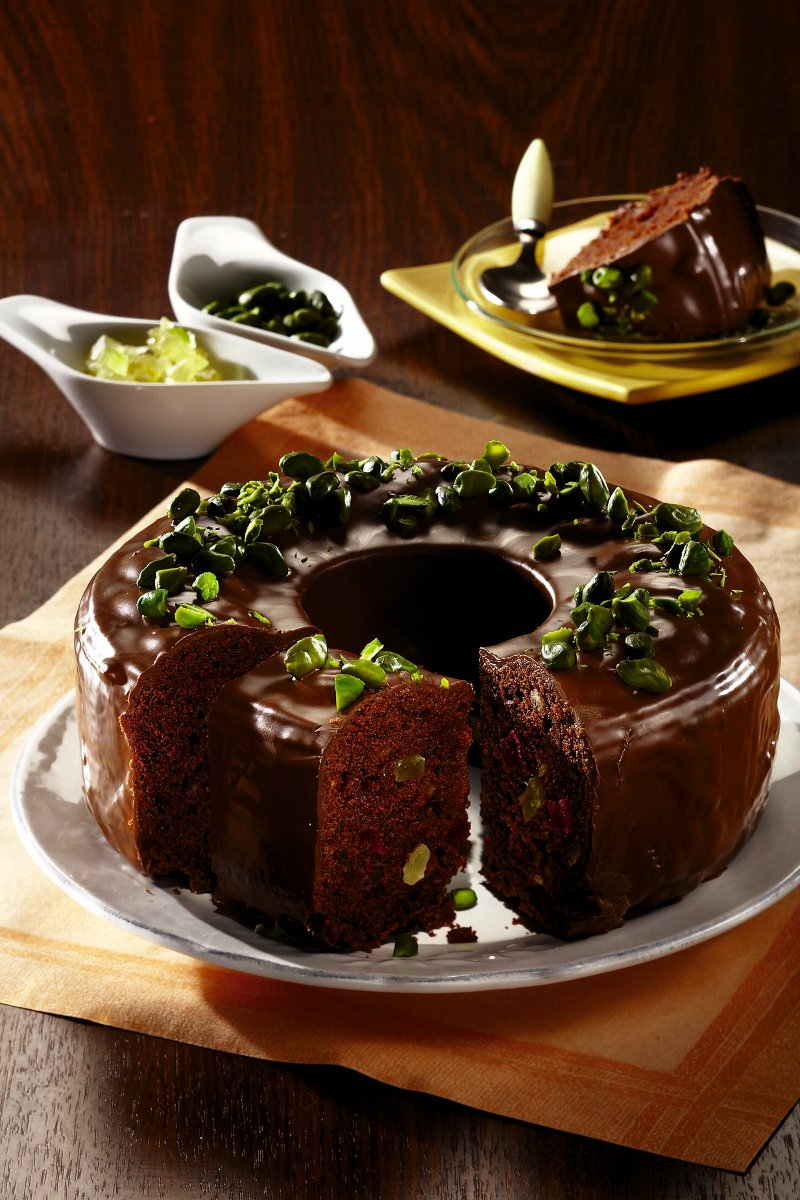 4. Fisticul se zdrobeşte. Se scoate blatul din cuptor, se lasă câteva minute să se răcească, apoi se glazurează cu ciocolata şi se ornează cu fistic. Se dă apoi la rece câteva ore.