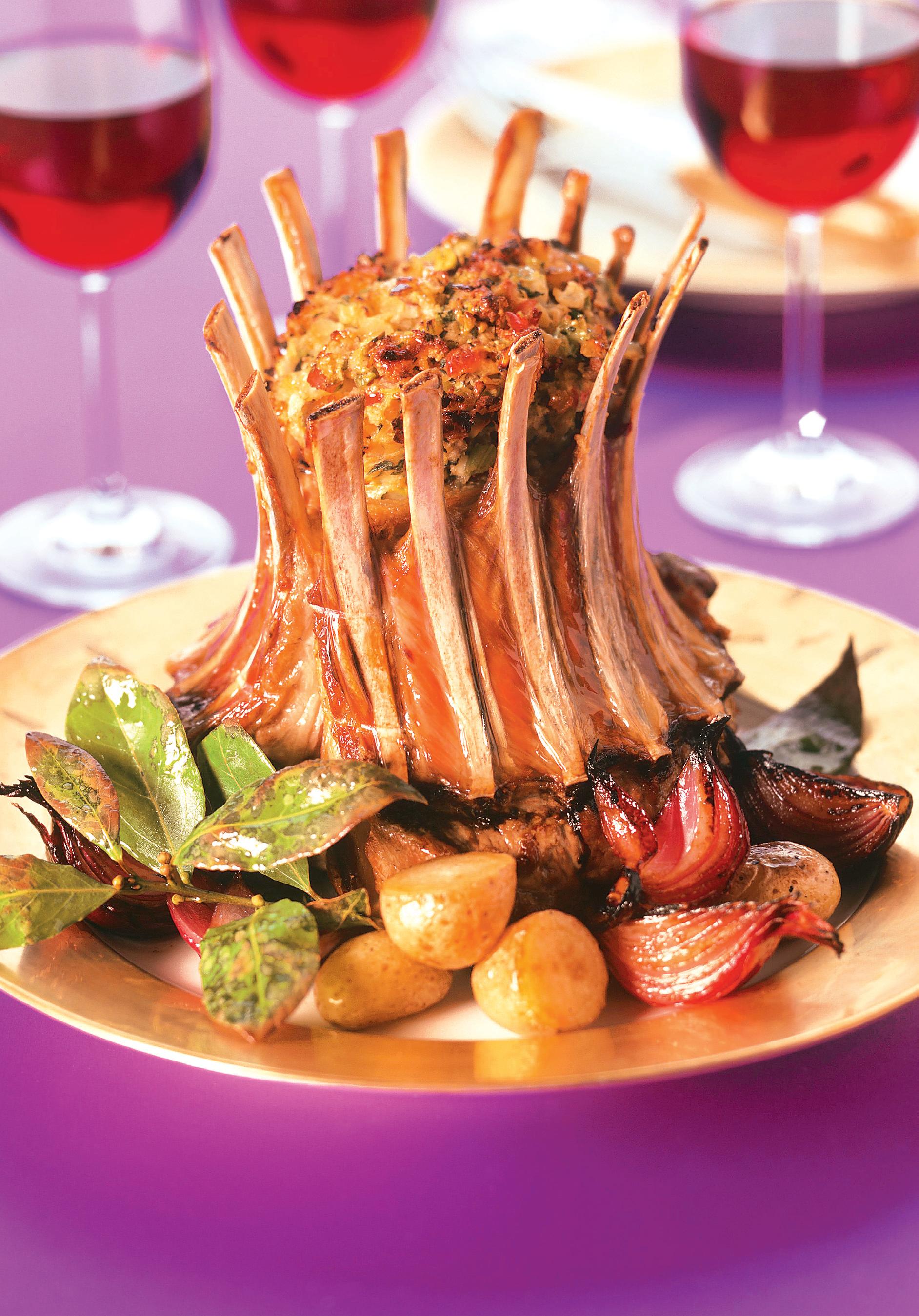 3. Se formează coroniţele din costiţe, ca în imaginea alăturată, şi se cos la capete. Se aşază apoi pe patul de ceapă din vasul de copt şi se umplu cu amestecul din miez de pâine, ouă şi condimente. Se coace la cuptorul încins la 200 C timp de 45 de minute, până prind o crustă aurie. Se servesc cu ceapă şi cartofi tăiate sferturi şi coapte în cuptor.