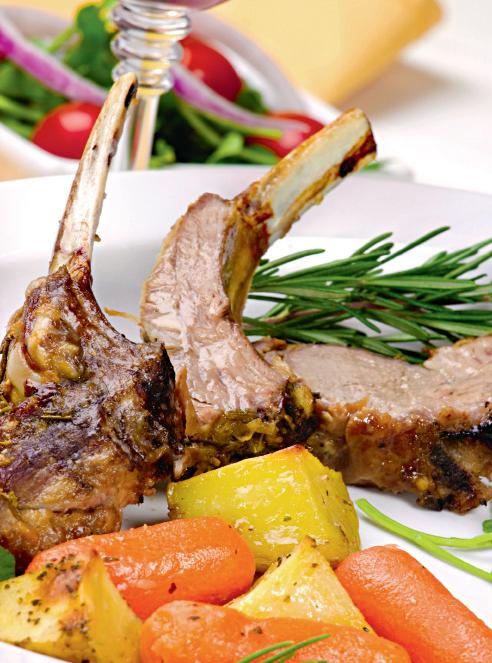 - În acest timp se pun morcovii şi cartofii să fiarbă în apă cu sare. După ce au fiert, se lasă să se scurgă în sită şi se călesc în untul topit. Se condimentează cu sare şi piper. Costiţele de miel se servesc cu soteul asortat şi se ornează cu crenguţe de rozmarin.