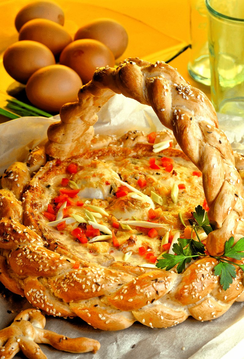 3. După coacere, se asamblează coşuleţul. În mijloc se toarnă umplutura, preparată din amestecul de smântână, pastramă tăiată cubuleţe, ardei tocat, ouă tăiate rondele, verdeţuri. Se nivelează umplutura şi se presară deasupra caşcavalul afumat ras. La final, se toarnă ouăle bătute, se unge şi colacul cu smântână şi se mai dă la cuptor 10 minute.