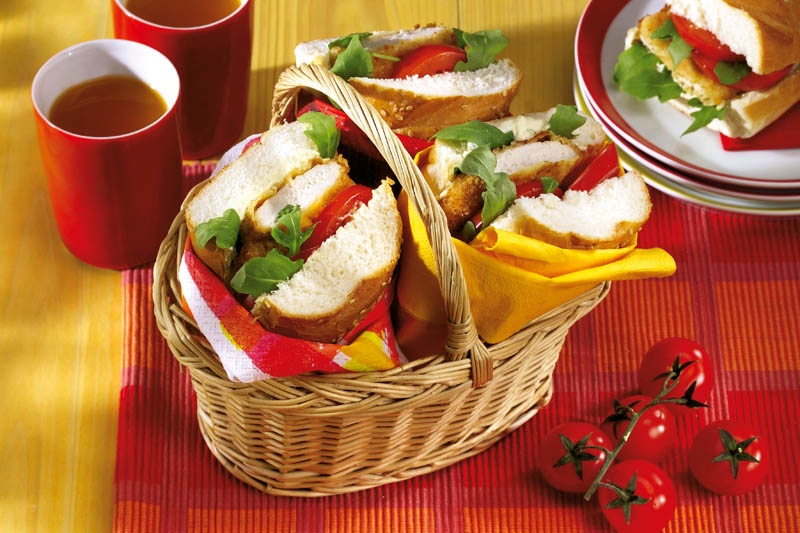 4. Separat, se taie baghetele, se ung cu crema de brânză, se taie roşiile rondele, se aşază şniţelele, se pun feliile de roşii şi se asezonează cu frunze de busuioc proaspăt. Se împachetează fiecare în folie şi şerveţele, se aranjază în coşuleţul pentru picnic şi se servesc la iarbă verde.