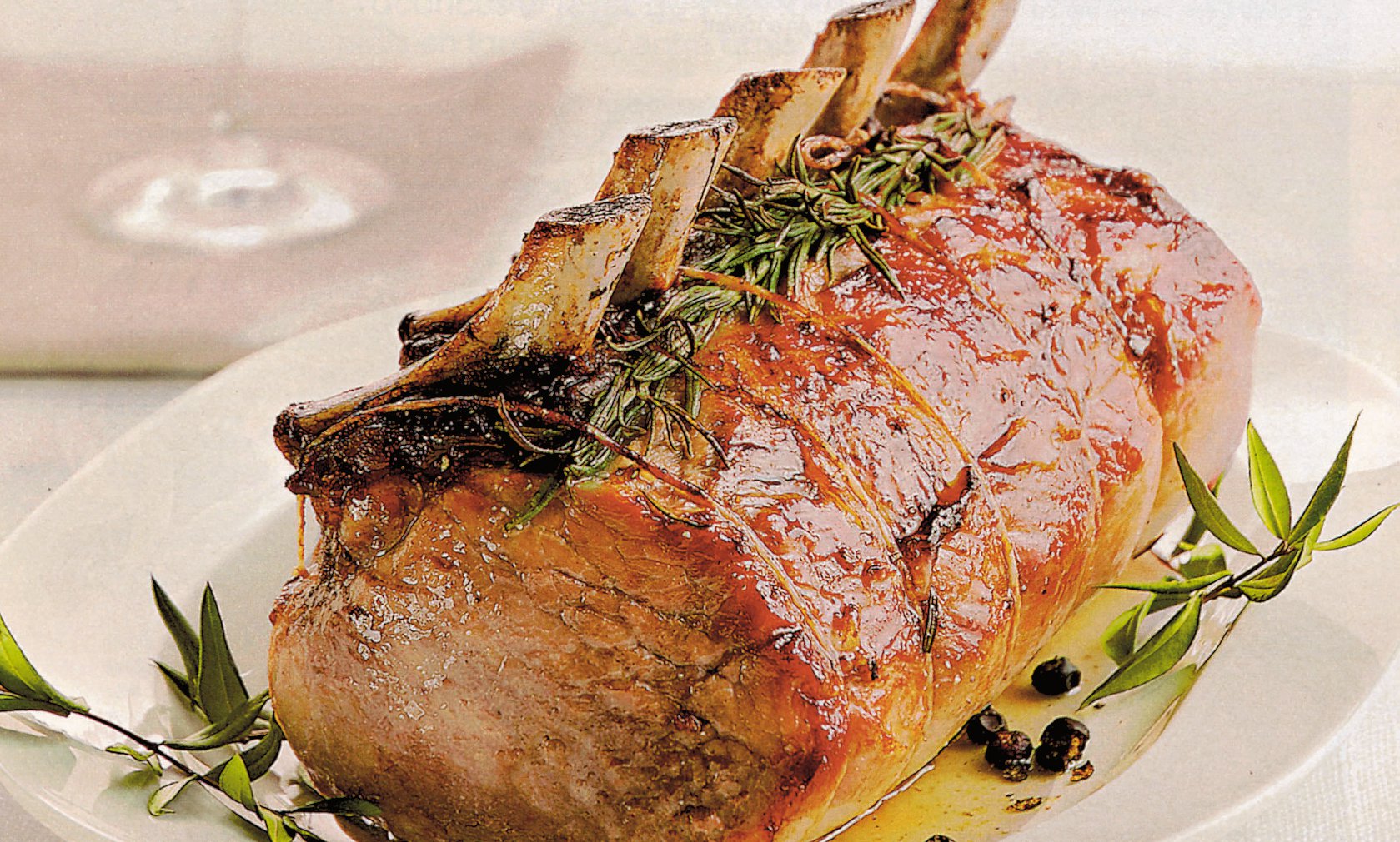 2. Se încinge cuptorul. Se leagă cotletul cu aţă, să capete o formă mai frumoasă, rotundă şi se prind deasupra 2-3 fire de rozmarin pentru aromă. Se aşază într-un vas şi se unge cu ulei. Se toarnă apoi tot sosul marinat şi se coace în cuptorul încins, la foc potrivit, aproximativ o oră. Dacă este rumenit şi nu este bine pătruns, se stropeşte cu sosul din tavă, apoi se acoperă cu o folie din aluminiu şi se mai coace 20-30 minute, la foc mic.