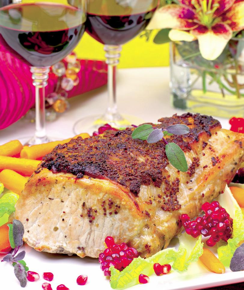 4. Morcovii fierţi se scot din apă, se scurg şi se pregătesc cu salata verde, ulei, sare şi oţet balsamic. Se scoate cotletul din tavă şi se taie felii subţiri care se servesc împreună cu sosul de merişoare, dulce-acrişor şi cu salata de morcovi. Se ornează cu frunzuliţe de busuioc proaspăt.