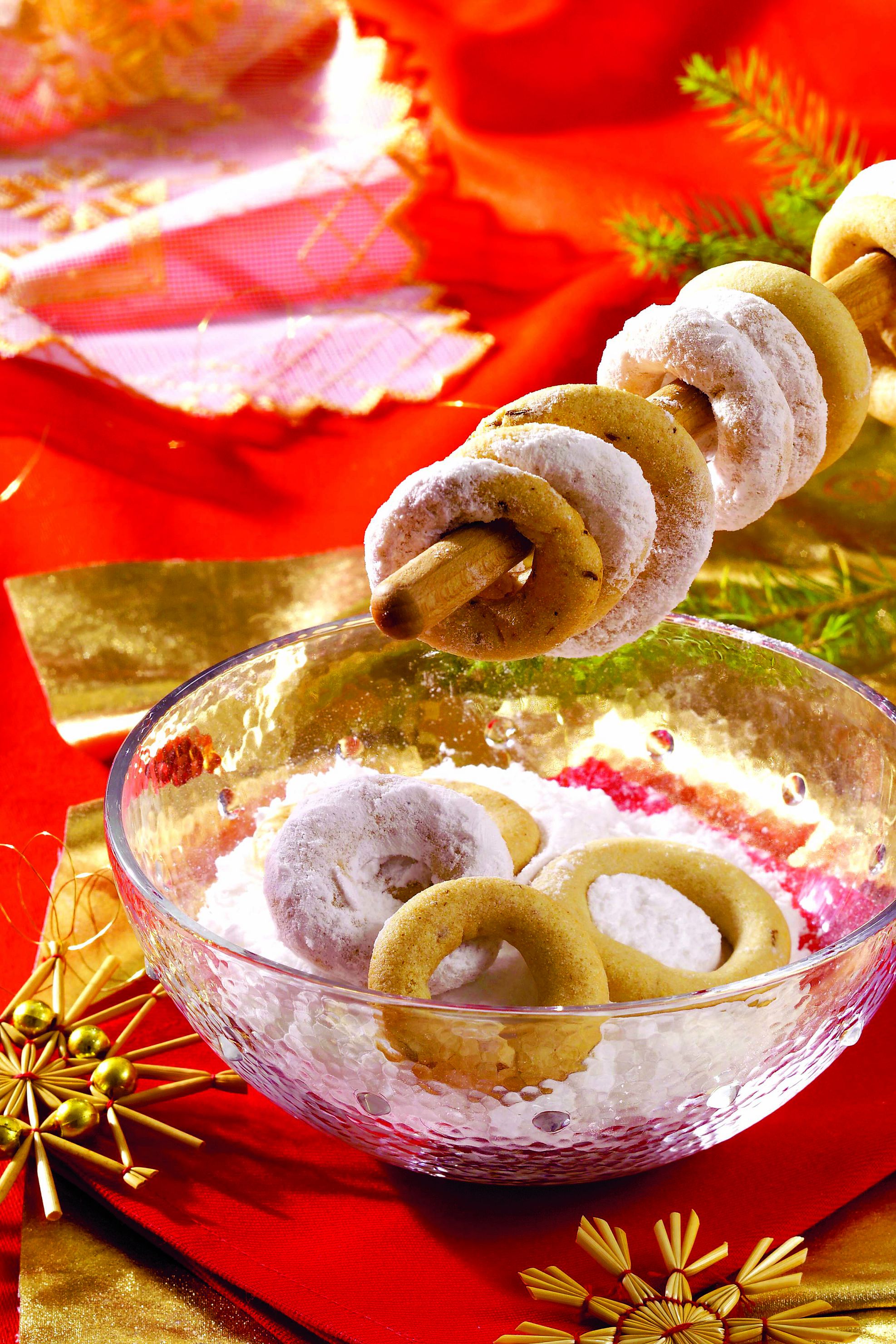 2. Se fac din aluat covrigei rotunzi, de mărimea dorită. Pe masa de lucru, se presară făină amestecată cu scorţişoară. Se aşază în tava tapetată în prealabil cu hârtie de copt. Se coc la foc potrivit, 20 minute. Când sunt aproape gata, se ung cu restul de unt topit, se presară deasupra zahăr şi migdale, nuci sau alune pisate.