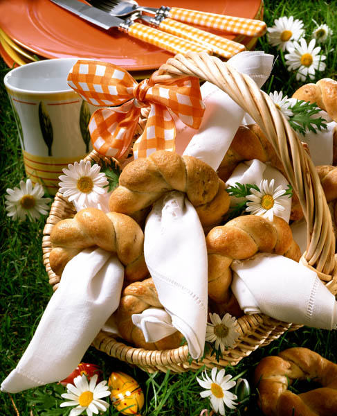 2. Aluatul crescut se taie în două, apoi se frământă din nou fiecare parte de aluat şi se împarte în şase. Din fiecare bucată de aluat se întinde câte un sul subţire, care se împleteşte în două şi se formează un covrig.