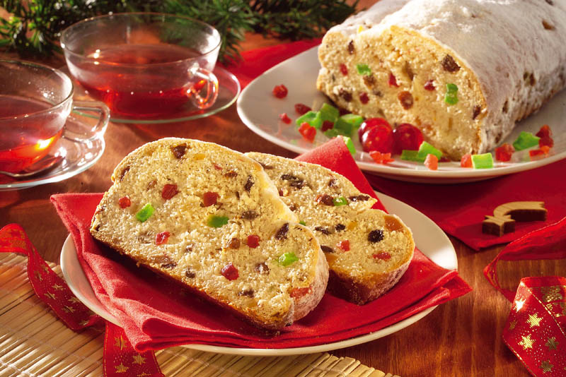 4. Când aluatul şi-a dublat volumul se întinde într-o foaie groasă de 1 cm. Se presară stafidele şi jeleurile, apoi se rulează şi se pune într-o formă tapetată cu hârtie pergament. Se lasă din nou să crească, la un loc cald, 15 minute. Se coace 35 – 40 minute, la foc potrivit, în cuptorul bine încins. Se scoate din formă, se unge imediat cu unt şi se presară zahăr pudră.