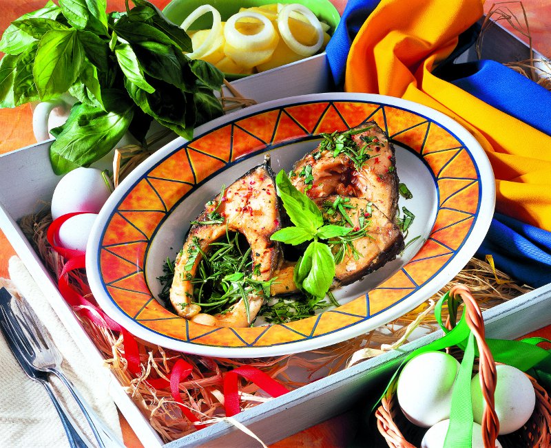 4. Când e gata, peştele se scoate din cuptor şi se stropeşte cu suc de lămâie. Se presară deasupra restul de verdeaţă şi se serveşte cu garnitura de cartofi.