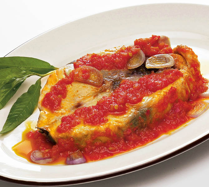 2. Se aşază bucăţile de peşte în tavă, se stropesc cu vinul amestecat cu apă şi puţin ulei de măsline şi se bagă în cuptorul încins în prealabil. Se stropesc cu sosul din tavă din când în când.