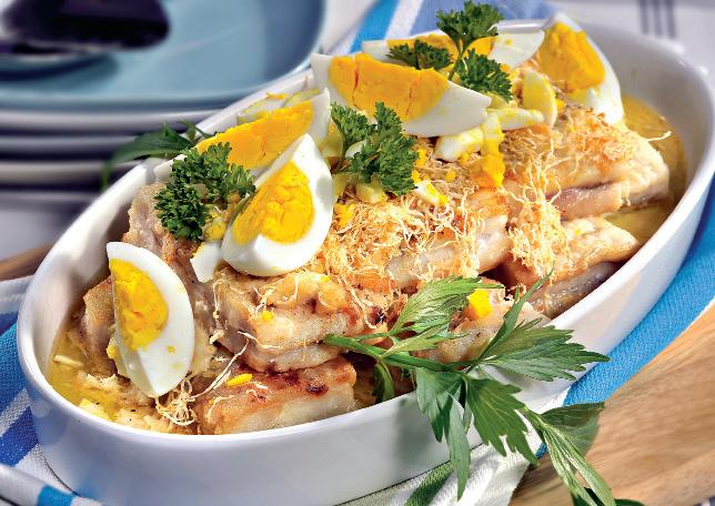 4. După ce s-au copt, se scot şi se acoperă cu felii de ouă fierte. Se mai presară parmezan, se stropesc cu sosul de vin şi se servesc ornate cu pătrunjel proaspăt şi cu felii de lămâie.