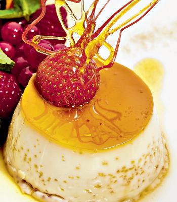 - Se pune zahărul într-o cratiţă şi se topeşte la foc mic. După ce a căpătat culoarea arămie, se toarnă în cupe termorezistente. Apoi se adaugă compoziţia de ouă şi lapte.