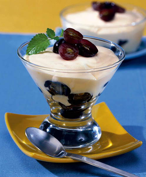 3. Jumătate din struguri se curăţă de sâmburi şi se pun în cremă. Se toarnă crema în boluri sau pahare pentru desert şi se ornează cu restul de struguri.