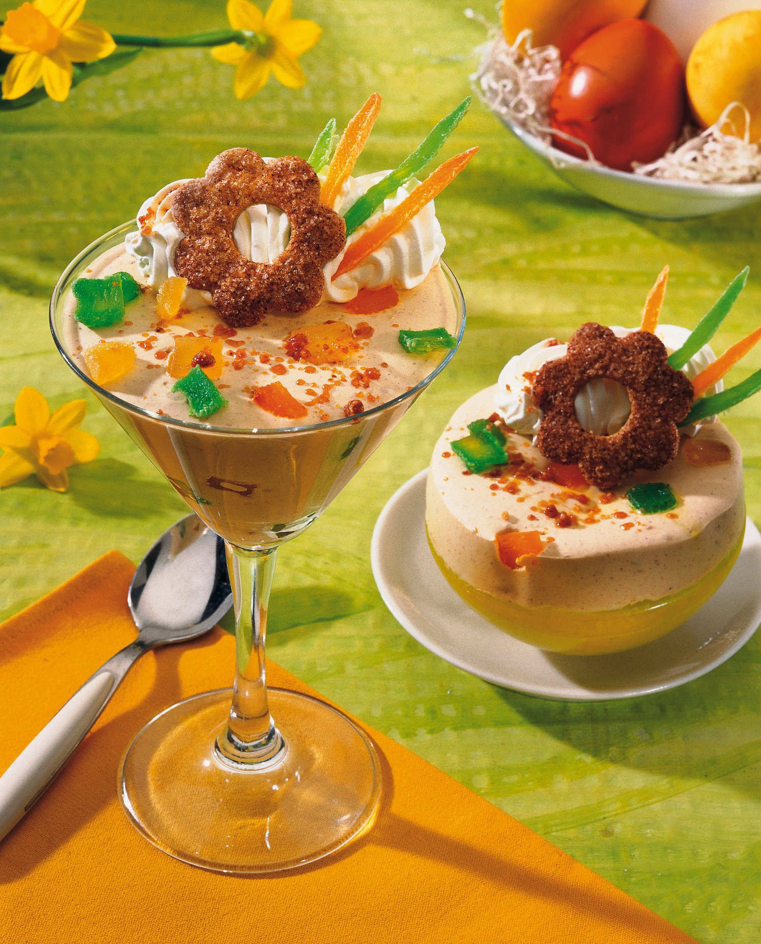 3. Se amestecă crema răcită cu fructele confiate, turta dulce rasă, nuca tăiată mărunt şi frişca. Se pune în cupe transparente şi se ornează cu puţină frişcă, fructe confiate şi biscuiţi. Se pudrează cu scorţişoară şi se serveşte imediat.