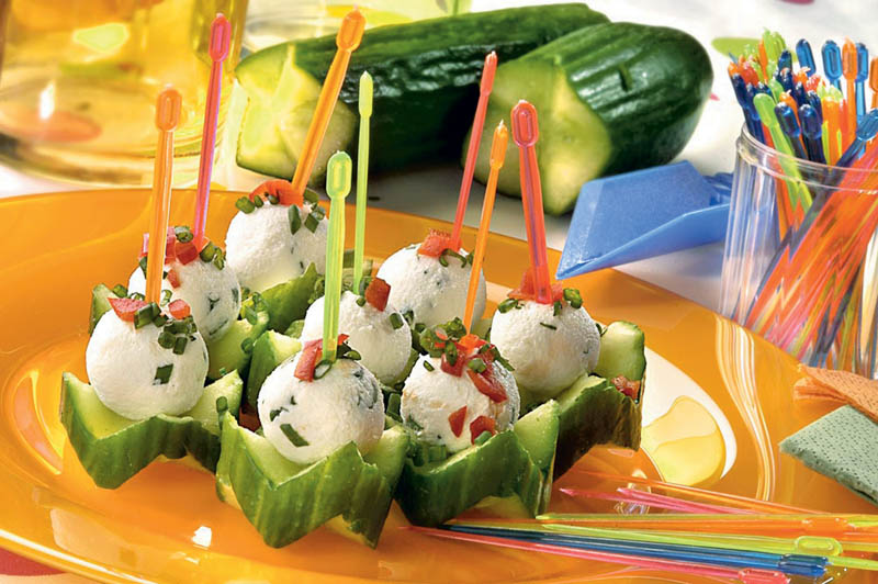 2. Se ia cu linguriţa din această compoziţie şi se modelează sfere mici, cam cât o nucă. Se pun în scobitori ornamentale şi se prind de felii de castraveţi tăiate în zigzag.