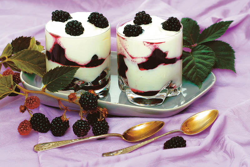 2. Brânza dulce se pasează şi se freacă cu mierea de lbine, până se obţine o compoziţie cremoasă. Se amestecă cu frişca şi se pune în pahare sau cupe, alternând cu straturi de mure.