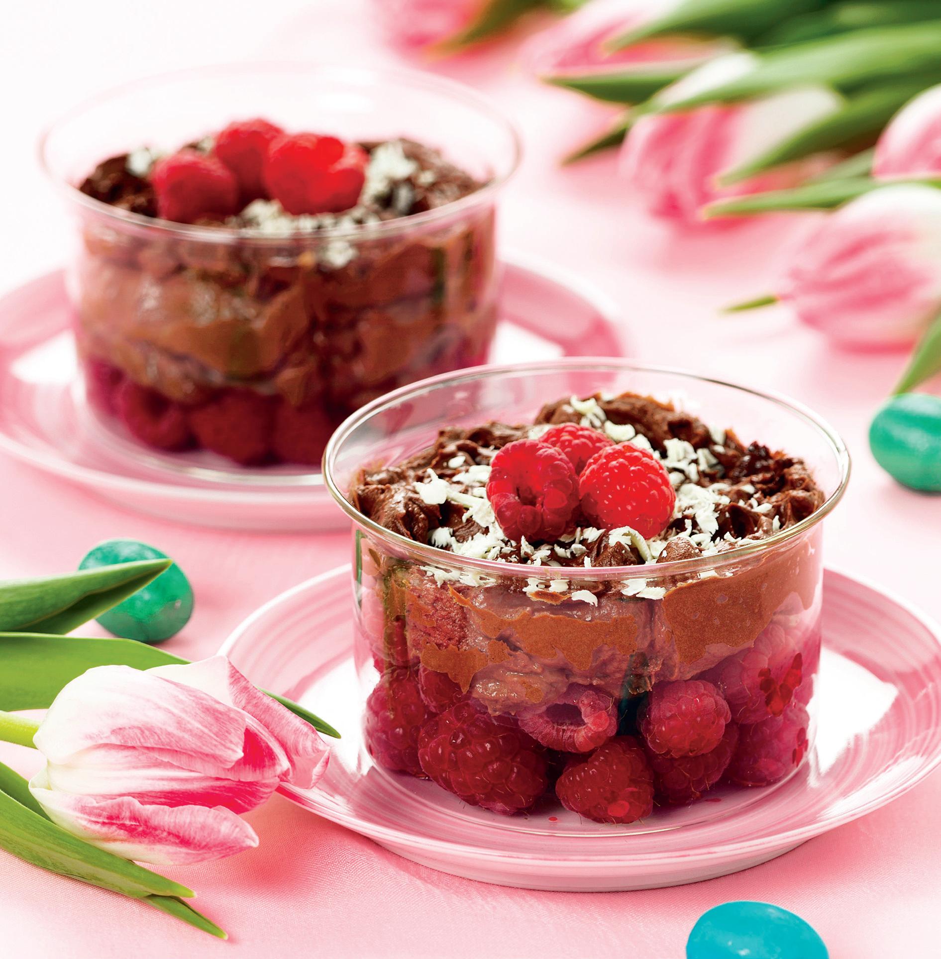 3. Zmeura se împarte în cele şase boluri, având grijă să se păstreze câteva fructe pentru ornat, apoi se toarnă crema de ciocolată într-un şuvoi subţire, cât mai uniform pe toată suprafaţa. Se pun bolurile la frigider pentru o oră şi se servesc ornate cu ciocolată albă şi câte 2-3 fructe proaspete.