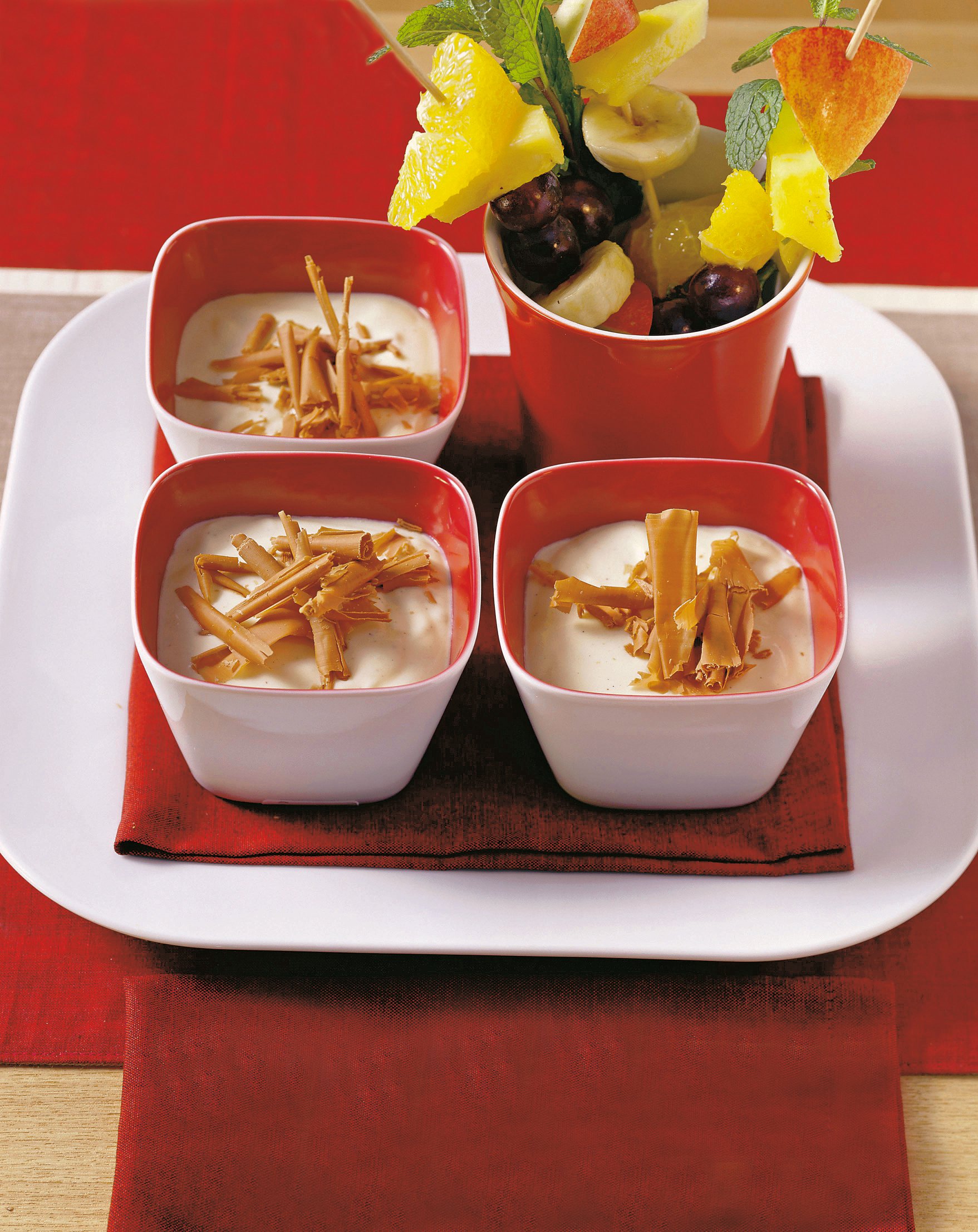 3. Fructele se spală şi se curăţă de coajă (dacă este cazul), apoi se taie cubuleţe sau rondele aproximativ egale. Se pun alternativ pe beţe de frigărui, apoi se stropesc cu zeamă de lămâie şi esenţă de rom. Se dau la rece şi se servesc cu compot de ananas şi crema de vanilie ornată cu ciocolată rasă.