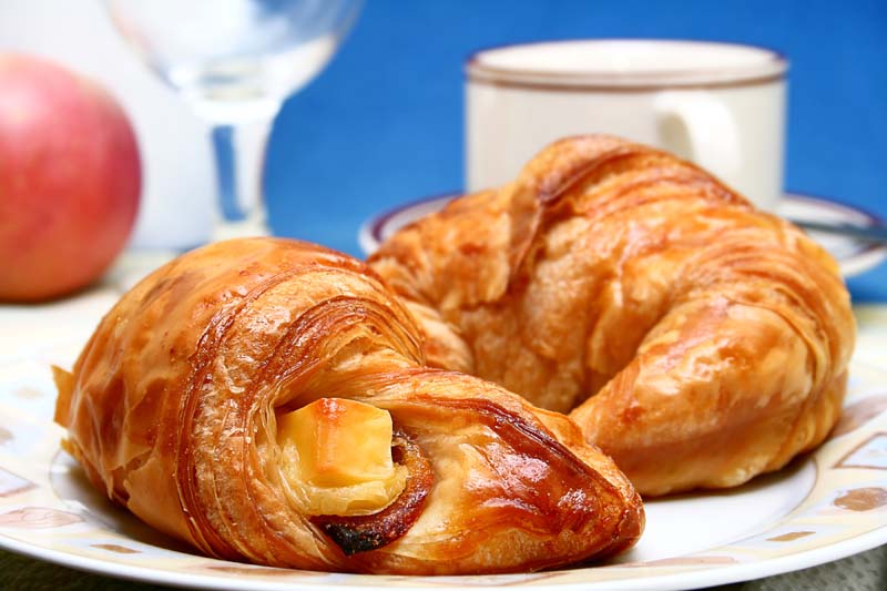 4. La sfârşit, se întinde aluatul într-o foaie mai mare rotundă, care se taie radial în 8 sectoare. Fiecare bucată de aluat se umple cu o lingură din umplutură şi câte o fâşie de caşcaval. Se rulează şi se aşază într-o tavă tapetată cu hârtie de copt. După 10 minute, se ung cu ou şi se coc în cuptorul dinainte încins, aproximativ 25 de minute.