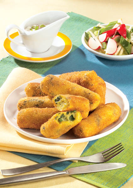 2. Separat, se spală ceapa verde, mărarul şi se toacă mărunt. Verdeaţa tocată se amestecă cu compoziţia de brânză şi se modelează crochetele.