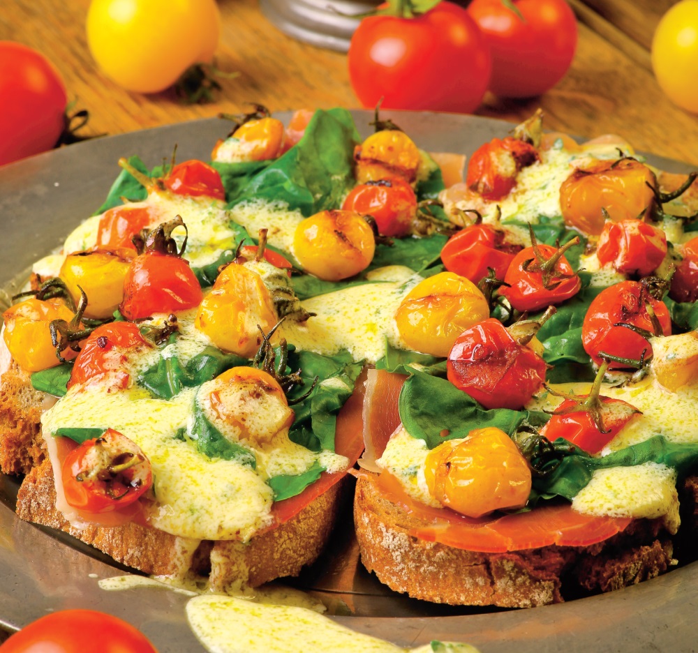 2. Între timp, se pregătesc crostini. Se aşază feliile de pâine în tava de copt, peste feliile de şuncă se pune caşcavalul şi busuiocul şi apoi se aşază roşioarele.