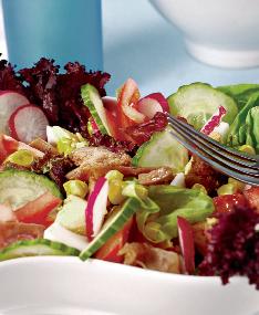 - Şalăul se desface bucăţi mici, se rup frunzele de salată, se taie ridichile şi ceapa, roşiile şi castraveţii şi se pun într-un bol. Se amestecă uşor să nu se înmoaie.