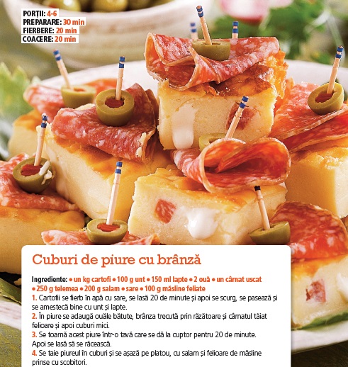 4. Se taie piureul în cuburi si se asaza pe platou, cu salam si felioare de masline prinse cu scobitori.