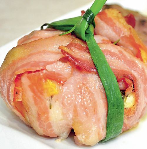 2. Pentru cuibul-garnitura, se foloseste un vas rotund care se tapeteaza la interior cu feliile de bacon, astfel încât capetele sa atârne peste buza vasului. În interior se pun sparanghelul taiat în 3-4 parţi, morcovul taiat pe lung în