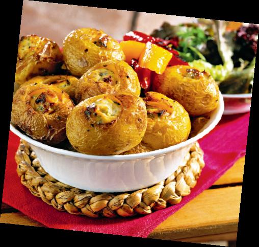 5. În acest timp, se coc ardeii, se curăţă de coajă şi de seminţe, se taie fâşii şi se pregătesc cu ulei, sare, piper şi oţet balsamic. Cartofii se servesc cu garnitura de ardei copţi şi cu salată verde.