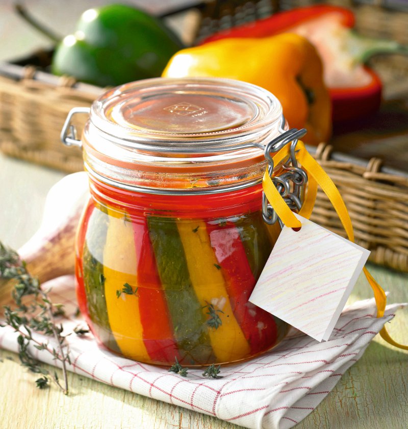 3. Se pun bucăţile de ardei în saramură şi se lasă la înmuiat circa 3 minute. Se scot şi se pun în borcane, alternându-se în funcţie de culoare. Printre bucăţile de ardei se pun fire de cimbru.