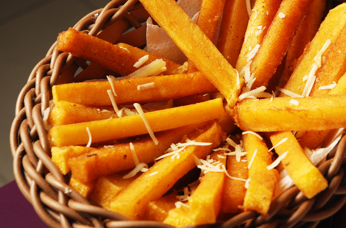 Taie mămăliga în formă de cartofi pai, după preferinţe şi dă la cuptor, pe hârtie de copt, circa 20 de minute, până devin crocanţi.