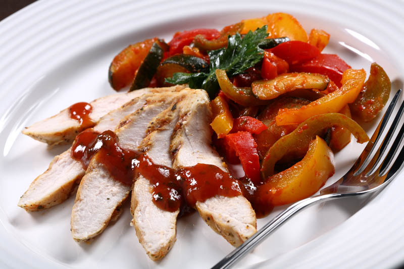 4. După ce s-a copt pieptul de curcan, se scoate din cuptor, se taie fâşii potrivite, se aşază pe un platou şi se stropeşte cu sos, iar tocana de ardei se pune lângă fâşiile de carne şi se ornează cu fire de pătrunjel.