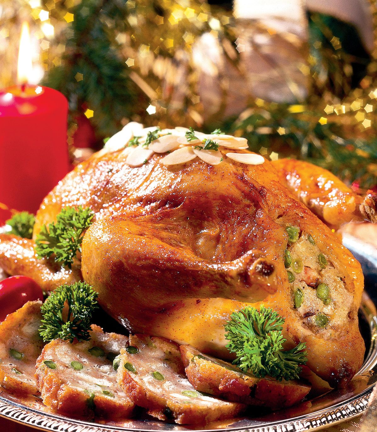 3. După ce s-a copt, taie curcanul bucăţi, presară carnea cu pătrunjel tocat, chilli şi fulgi de alune. Dacă ţi-a mai rămas umplutură, pune-o într-o tavă de chec şi coace-o la foc potrivit.