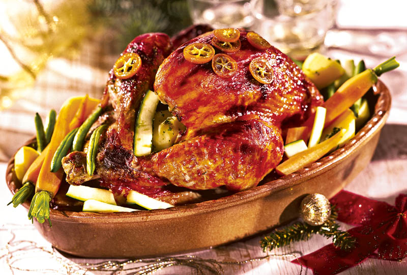 4. Se tapetează o tavă cu unt şi ulei, se aşază curcanul cu pieptul în jos şi se bagă în cuptorul cald. Se lasă să se rumenească şi se întoarce cu pieptul în sus. Se umple cu legumele fierte, se aşază deasupra feliuţe de roşii şi se mai lasă să se rumenească, apoi se serveşte cald.