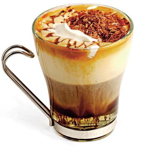 Se dizolvă zahărul în cafea, apoi se distribuie egal în pahare. Se ia laptele, se bate spumă şi se adaugă deasupra. Apoi se pune câte o linguriţă de frişcă, după care se presară praful de scorţişoară şi ciocolata rasă.
