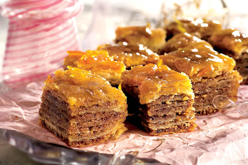 1. Se face un sirop din zahăr, 3-4 linguri de apă, coajă de lămâie şi de portocală, vanilie şi se amestecă cu nucile până se obţine o cremă groasă.