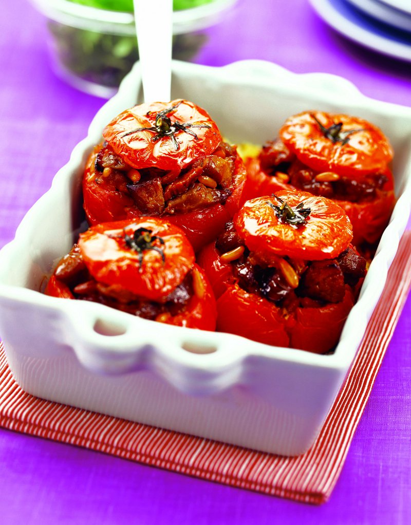 2. Se taie roşiile, se scoate miezul, se umplu cu compoziţia de carne şi se acoperă cu capacele rămase din ele. Se aşază într-o tavă pentru friptură.