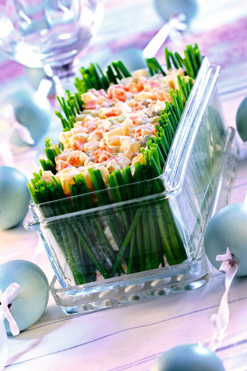 3. Codiţele de ceapă verde se spală, se lasă la scurs şi se taie “bastonaşe” egale ca lungime, pentru a fi folosite la ornat, de jur împrejur, vasul de sticlă în care se pune salata.