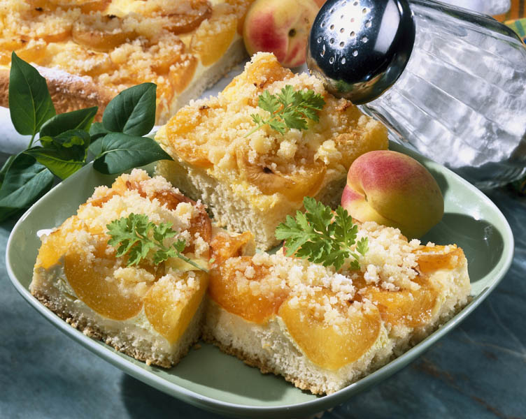 4. Spălaţi caisele, scoateţi sâmburii şi tăiaţi-le în jumătăţi. Se pun peste umplutură, cu scobitura în jos. Deasupra se se rade pe răzătoare aluatul sfărâmicios. Se dă tava la cuptorul încălzit în prealabil. Se coace 40-45 min la foc mic. Se lasă la răcit, apoi se taie în pătrate potrivite. Se pudrează cu zahăr şi se ornează cu frunzuliţe de mentă sau cu sirop de lămâie, pentru un plus de savoare.