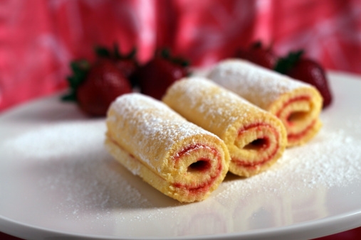 4. Se întinde coca, se taie fâşii, se umplu cu compoziţia şi se rulează. Se aşază în tava tapetată cu hârtie şi se coc. Se servesc pudrate cu zahăr.
