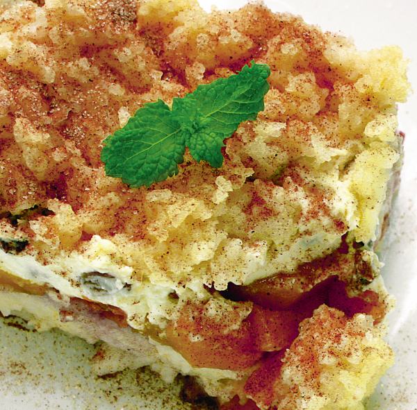 3. Odata orezul fiert, se lasa sa se racoreasca si apoi se pune un prim strat într-un vas de servit. La mijloc se asaza felii de fructe si se acopera cu orezul fiert în lapte. Se presara cu scorisoara si se da la rece pentru o ora. Se serveste cu frunzulie de menta.
