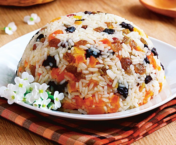 3. Orezul calduţ se amesteca cu miere si fructele uscate si se pune într-un bol umezit cu apa.