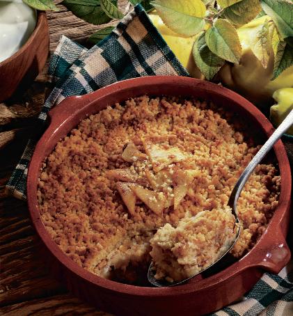 4. Se scoate aluatul de la rece, se rade pe răzătoarea mare şi se presară un strat gros în tava tapetată cu unt şi cu făină. Se adaugă un rând de nucă măcinată, un strat de gutui şi unul de aluat. Se ornează cu feliuţe de gutui şi se bagă în cuptor, la 180° C. După ce s-a copt, se serveşte cu smântână dulce sau frişcă.
