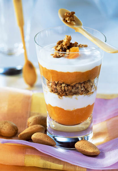 3. Se toarnă în pahare straturi alternative de piure de caise, iaurt şi cereale cu miere. Se serveşte imediat sau în cazul copiilor mari, mai întâi se răceşte.