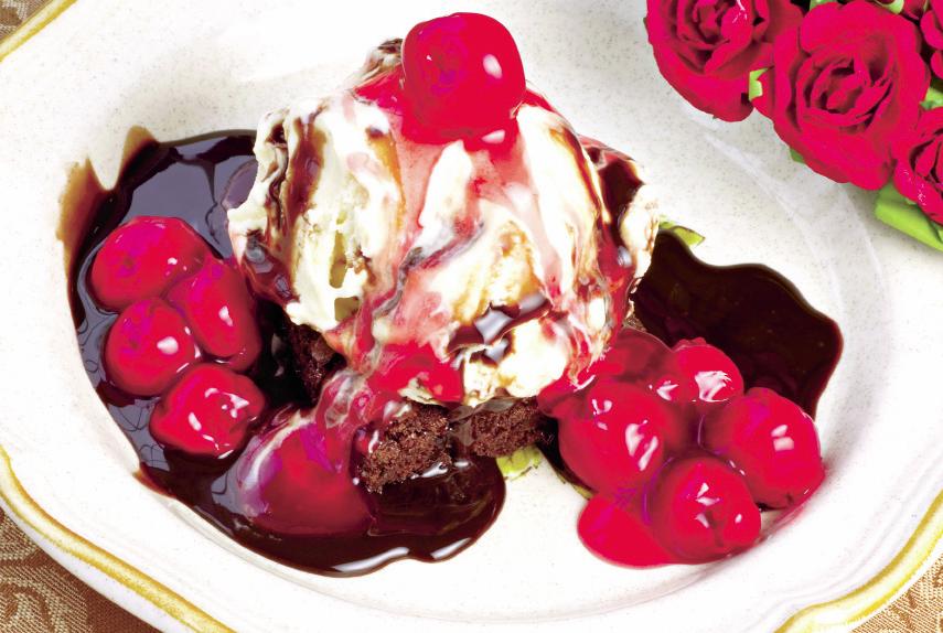 4. După ce s-a copt blatul de negresă, se porţionează şi se aranjează pe farfurii mici. Peste fiecare bucată de prăjitură, se toarnă topingul de ciocolată, îngheţata de vanilie şi topingul de cireşe. Se ornează cu frunzuliţe de mentă şi se serveşte cu cireşe.