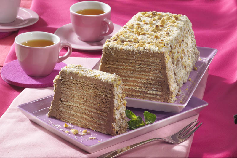 4. Se presează cu ceva greu şi se scoate din formă, se îmbracă cu crema şi se tapetează cu nuca şi praful de cocos. Se bagă la frigider aproximativ 2-3 ore, se taie bucăţi subţiri şi se serveşte la cafea sau la ceai.