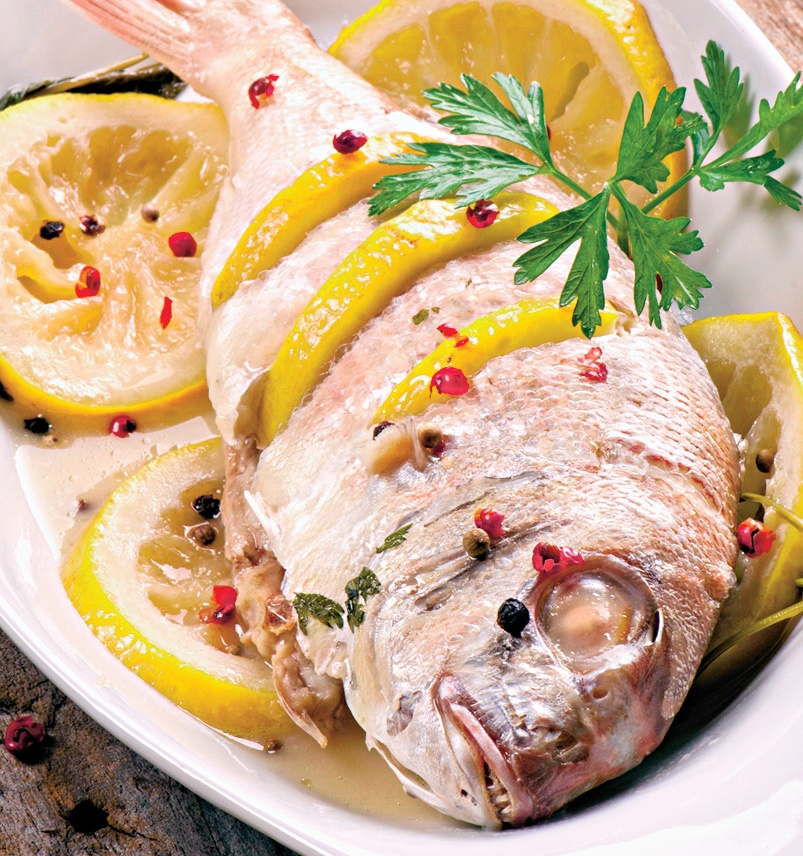 3. În tava de copt, se aşază un pat de felii de lămâie, pe care se așază peştele, deasupra se toarnă ulei şi se dă la cuptor pentru 20 de minute, dacă e un peşte mic sau 30 de minute, dacă e mai mărişor. Se scoate şi se ornează cu piper negru şi roşu şi cu pătrunjel.