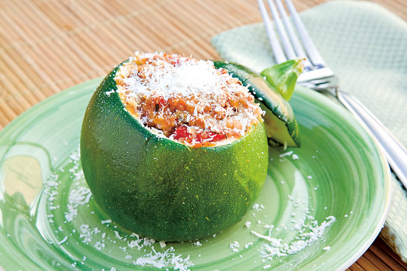 4. Roşiile se opăresc, se pasează cu blenderul şi se toarnă în compoziţia de pe foc. Se lasă să scadă la foc potrivit şi se amestecă cu puţin pesmet. Se scot dovleceii, se umplu cu această compoziţie, apoi se mai lasă câteva minute în cuptor să prindă crustă. Se servesc ornaţi cu parmezan.