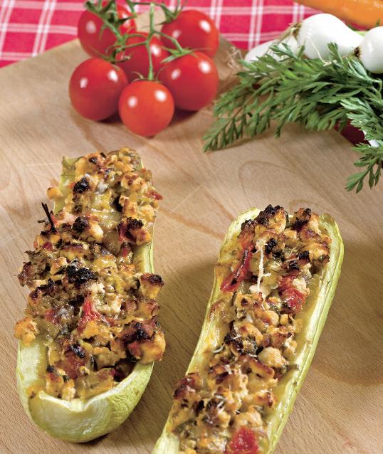 1. Dovleceii se spală bine şi li se taie ambele capete. Se despică pe din două şi se scobesc cu lingura, astfel încât să rămână destulă pulpă pe coajă (de aceea trebuie să fie dovlecei mari). Miezul scobit se păstrează pentru umplutură.