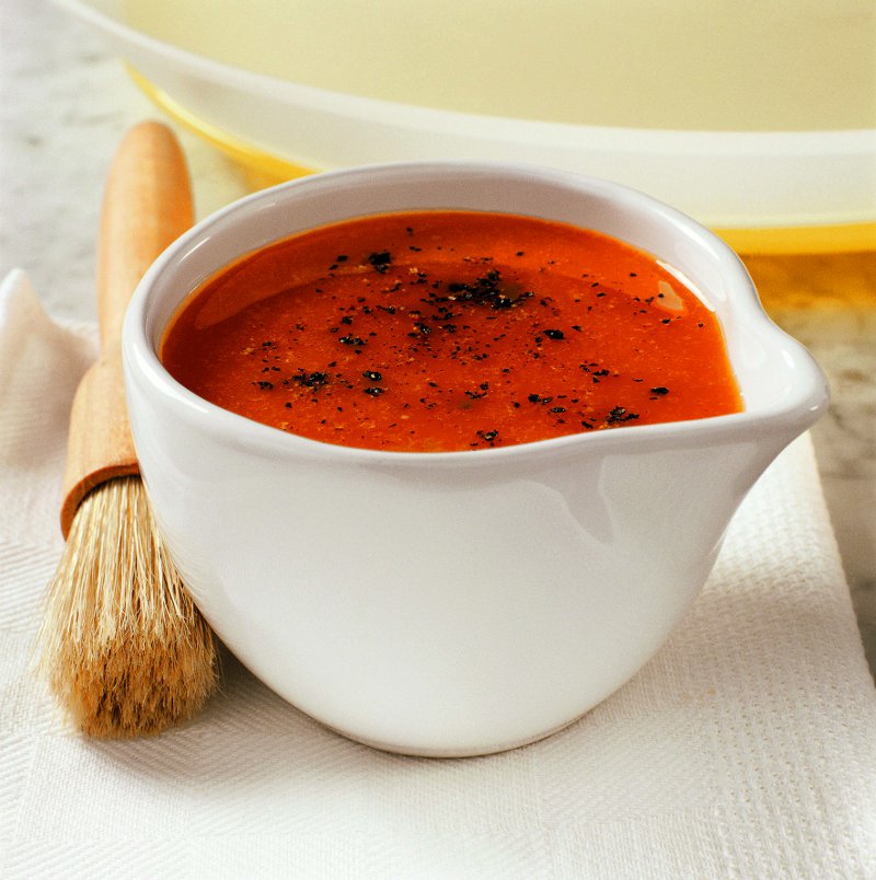 2. În continuare, se adaugă pudra de ardei, un praf de piper. Se adaugă apa minerală şi se dă la rece. Se poate folosi ca atare, ca sos, la fripturi din peşte sau porc ori ca marinată, în care se ţin fripturile cu câteva ore înainte de a fi preparate la grătar.